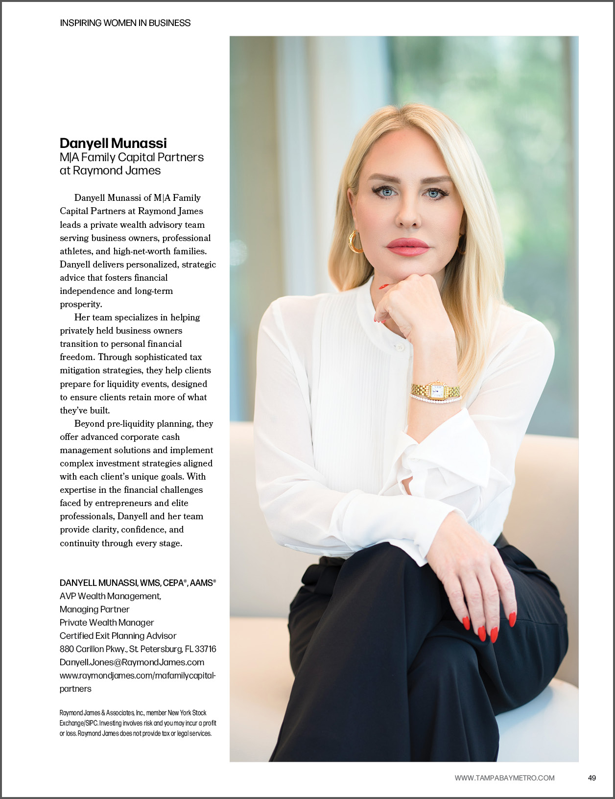Danyell Munassi of M|A Family Capital Partners at Raymond James leads a private wealth advisory team serving business owners, professional athletes, and high-net-worth families. Danyell delivers personalized, strategic advice that fosters financial independence and long-term prosperity.