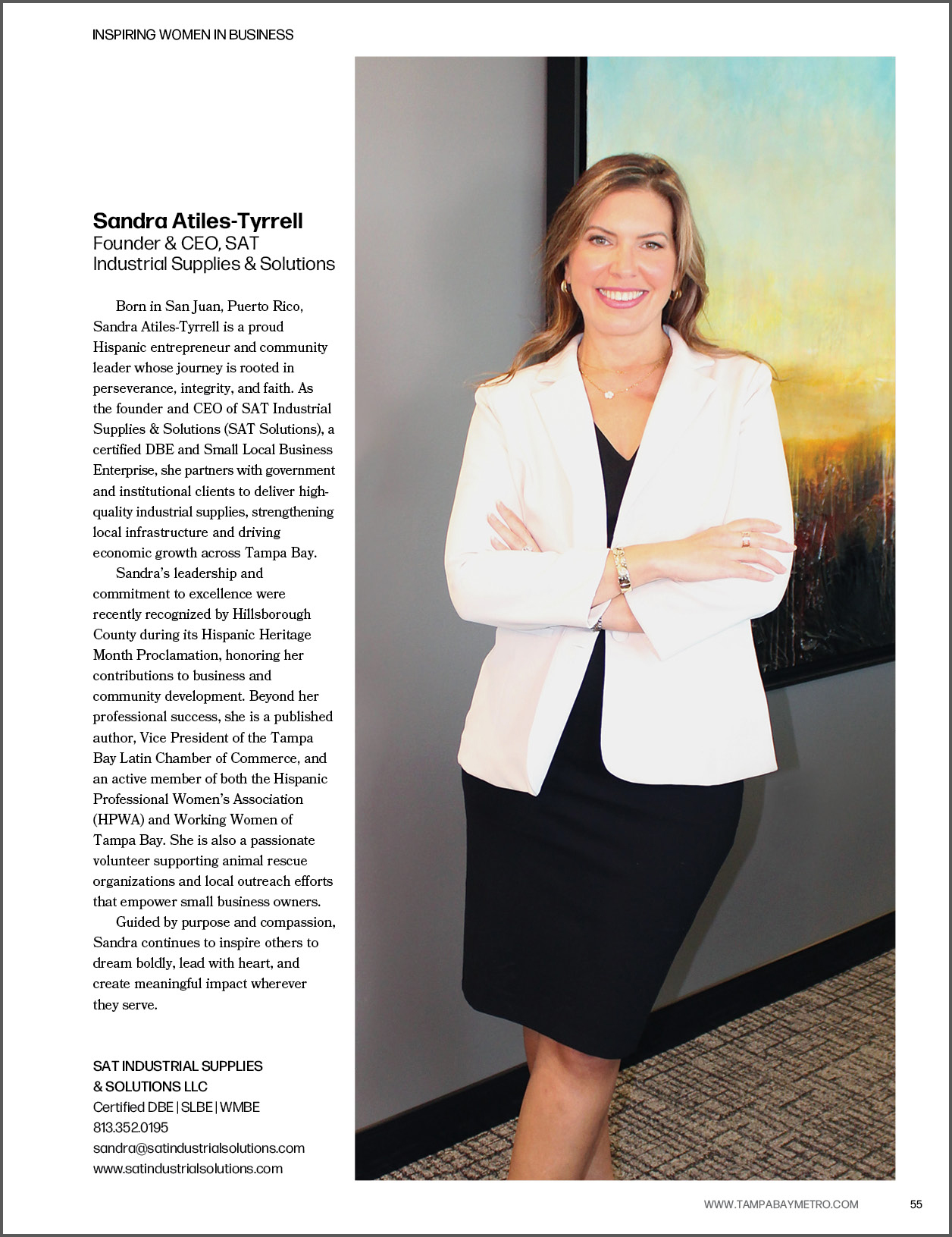 Born in San Juan, Puerto Rico, Sandra Atiles-Tyrrell is a proud Hispanic entrepreneur and community leader whose journey is rooted in perseverance, integrity, and faith. As the founder and CEO of SAT Industrial Supplies & Solutions (SAT Solutions), a certified DBE and Small Local Business Enterprise, she partners with government and institutional clients to deliver high-quality industrial supplies, strengthening local infrastructure and driving economic growth across Tampa Bay.