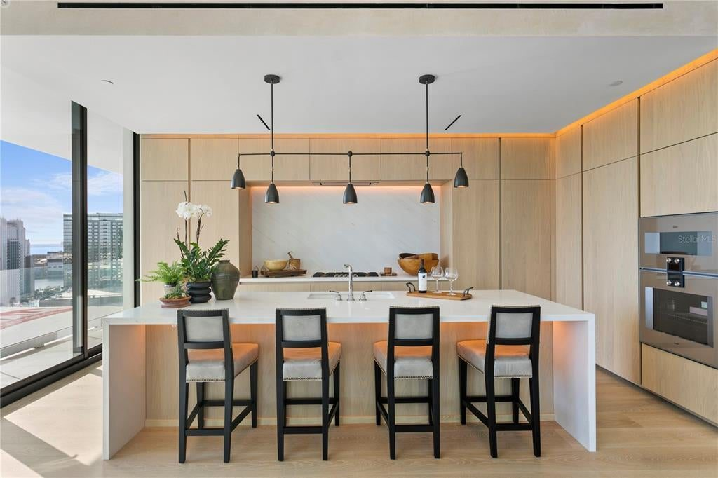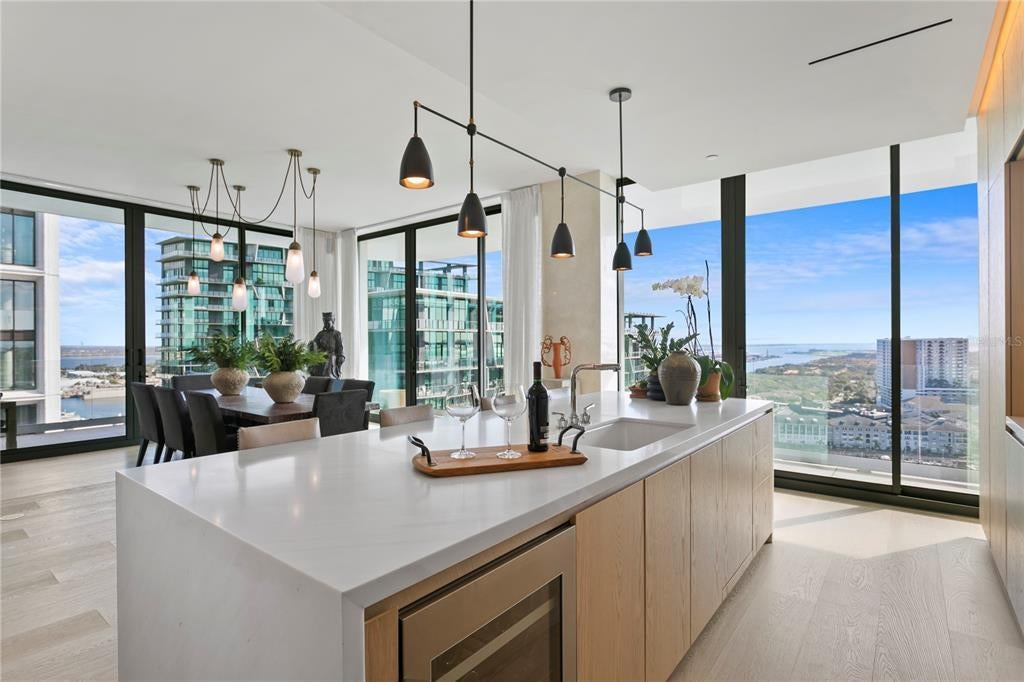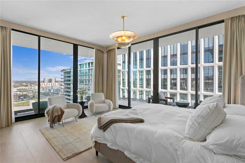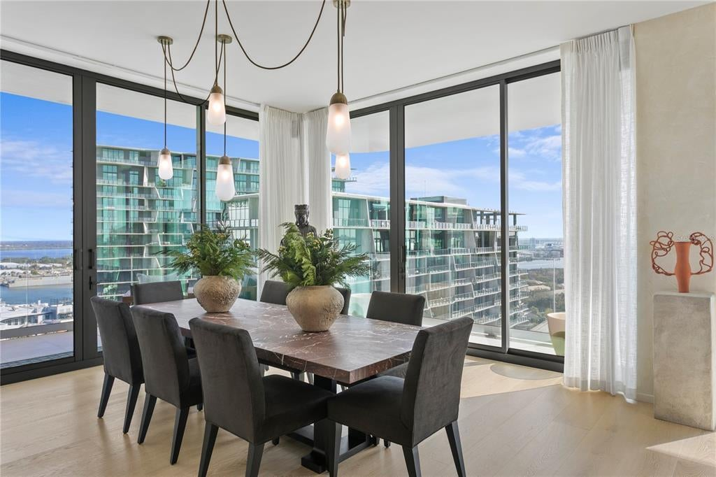 The interior blends seamlessly with the exterior to offer plenty of indoor-outdoor space for relaxing and enjoying the panoramic views of the Tampa skyline. The floor-to-ceiling windows and multiple sliding glass doors allow for sunlight to beam through on the balconies for total escape, or fun spots to entertain.