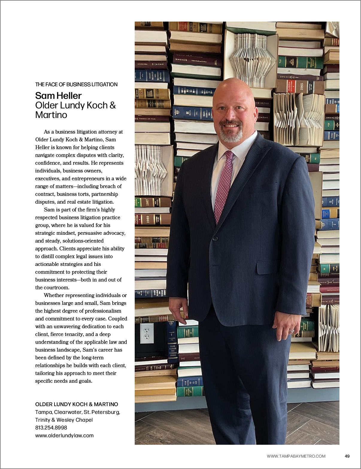 As a business litigation attorney at Older Lundy Koch & Martino, Sam Heller is known for helping clients navigate complex disputes with clarity, confidence, and results. He represents individuals, business owners, executives, and entrepreneurs in a wide range of matters—including breach of contract, business torts, partnership disputes, and real estate litigation.