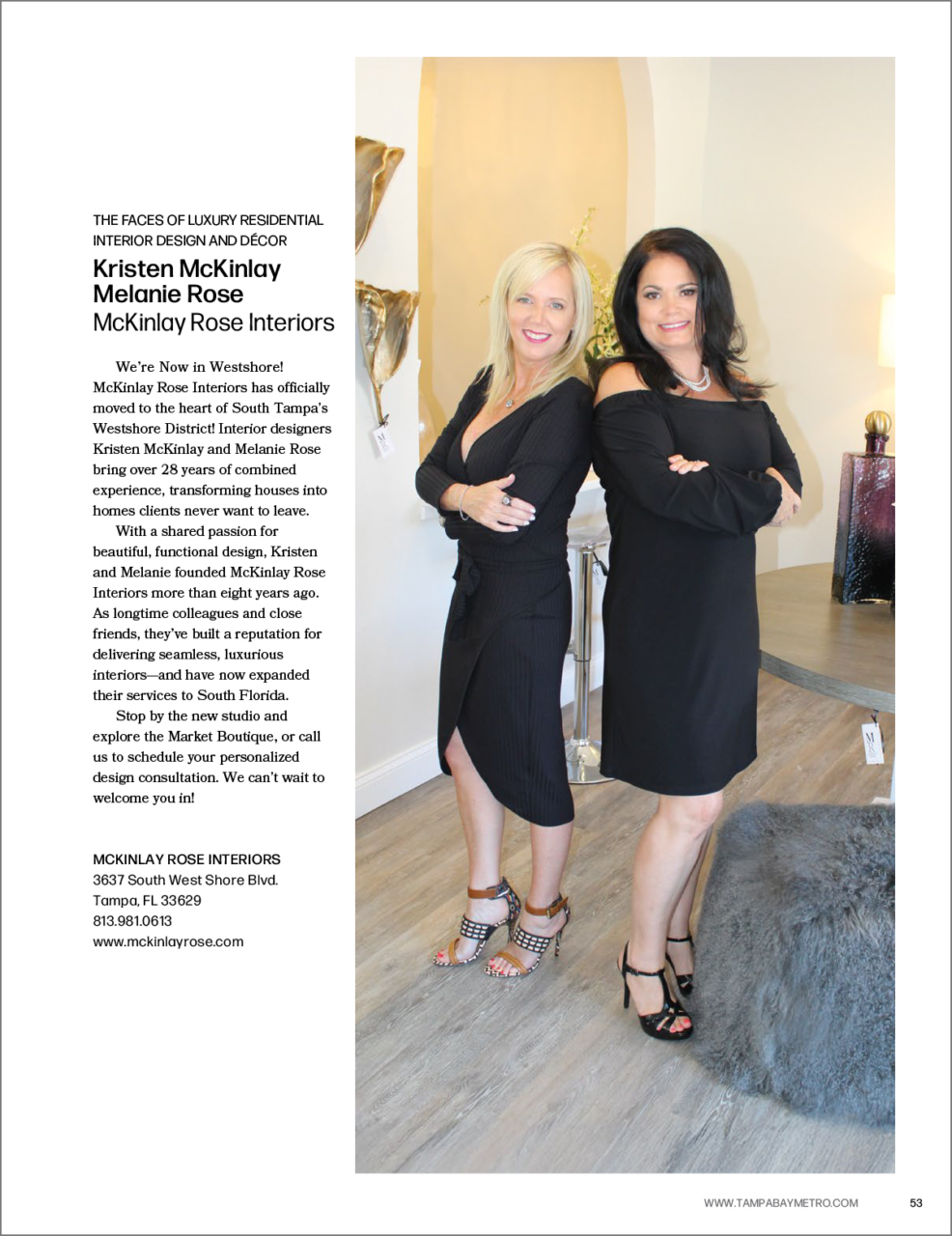 We’re Now in Westshore! McKinlay Rose Interiors has officially moved to the heart of South Tampa’s Westshore District! Interior designers Kristen McKinlay and Melanie Rose bring over 28 years of combined experience, transforming houses into homes clients never want to leave.