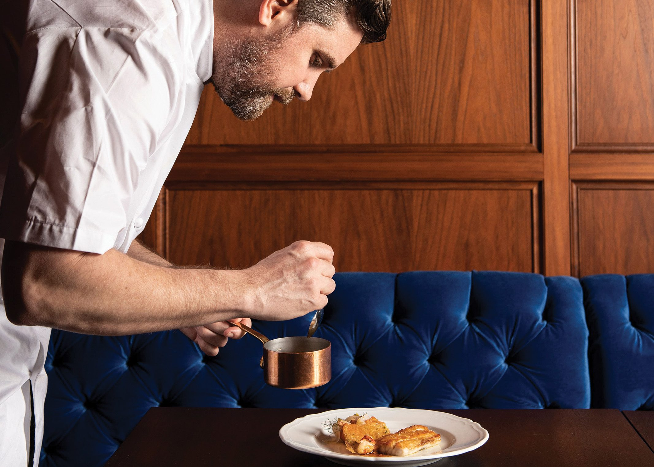 Renowned Chef John Fraser adds the finishing touches to an entrée at Lilac.
